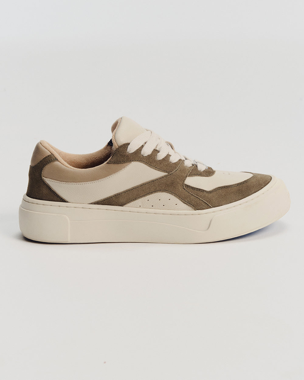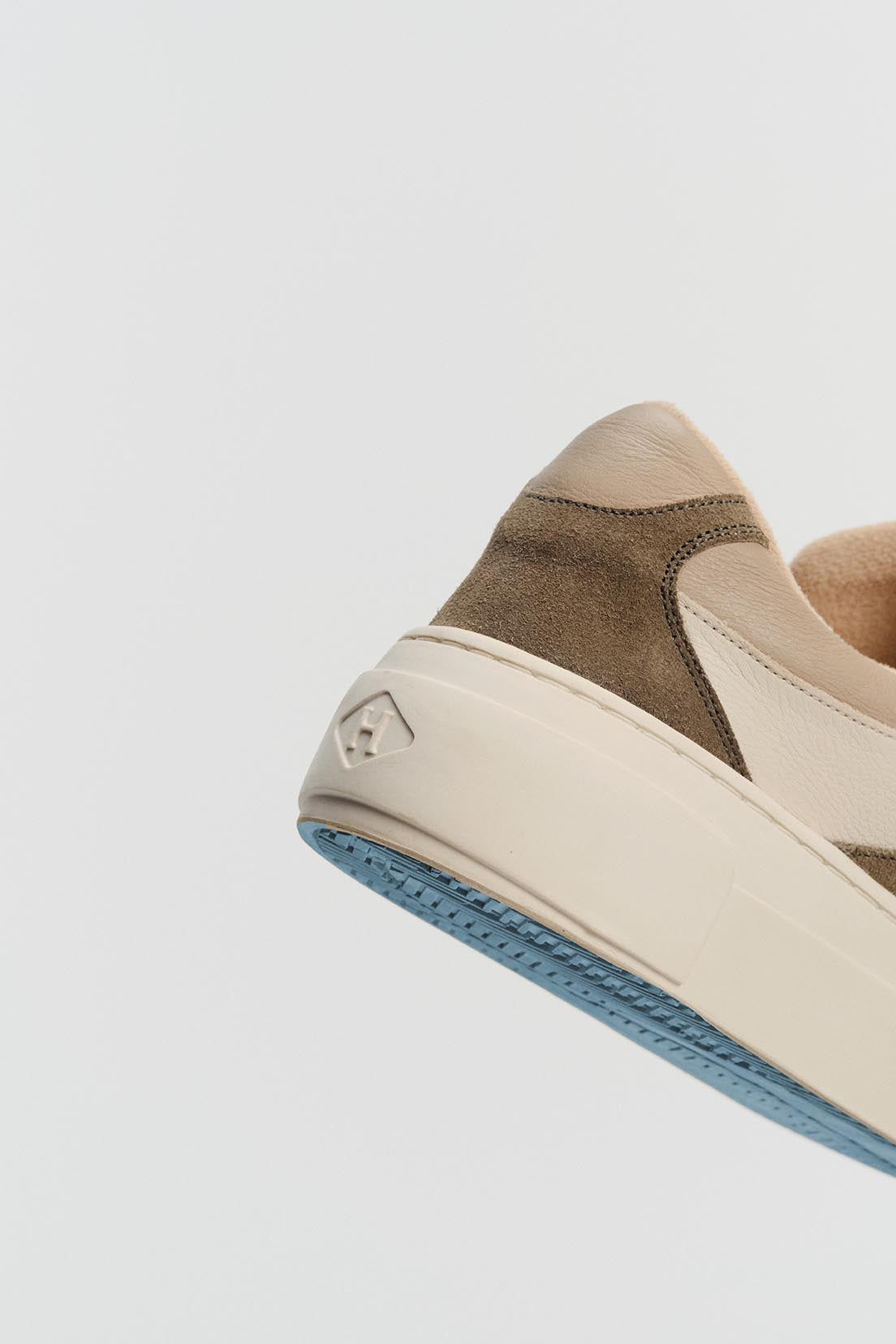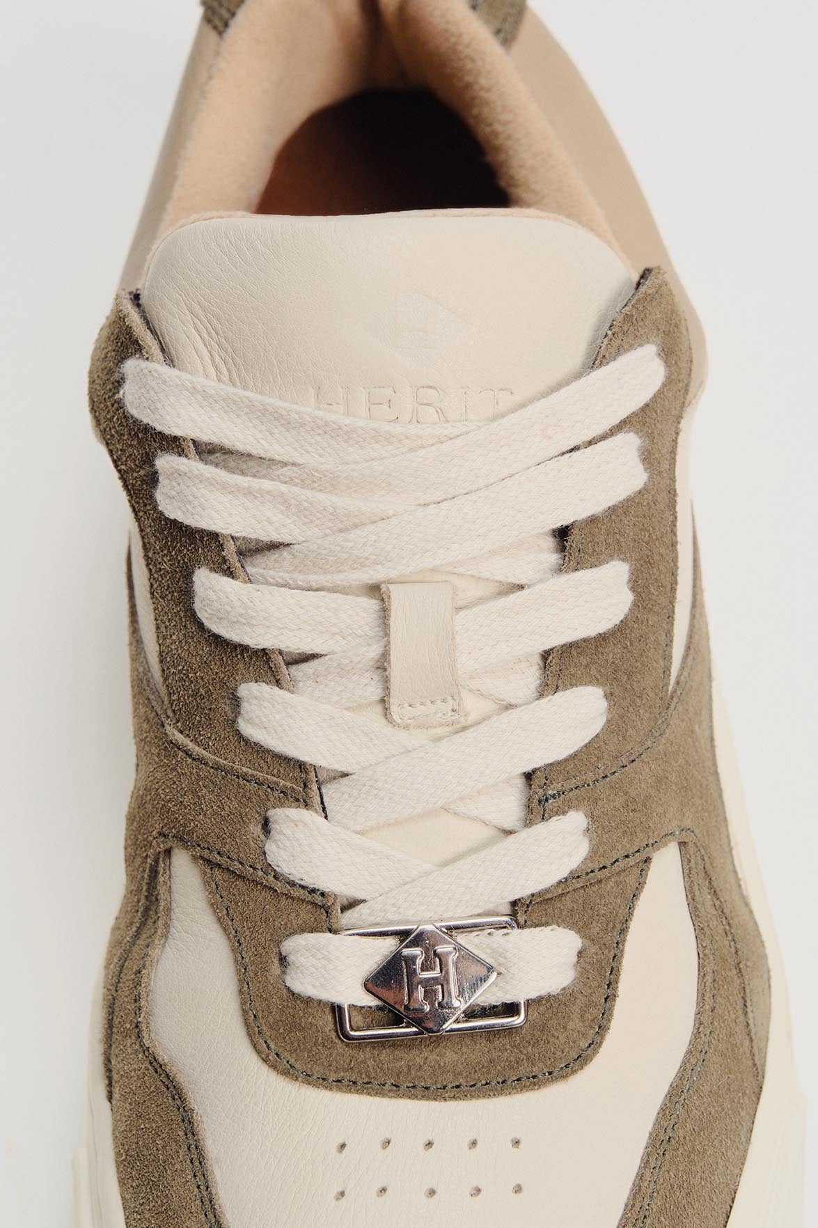 Solado bicolor de borracha com pigmentação exclusiva Herit, com cor do solado enviada de forma sortida. Upper em camurça e couro 100% premium nas tonalidades camurça oliva e super light neve, com perfurações estratégicas para respirabilidade.