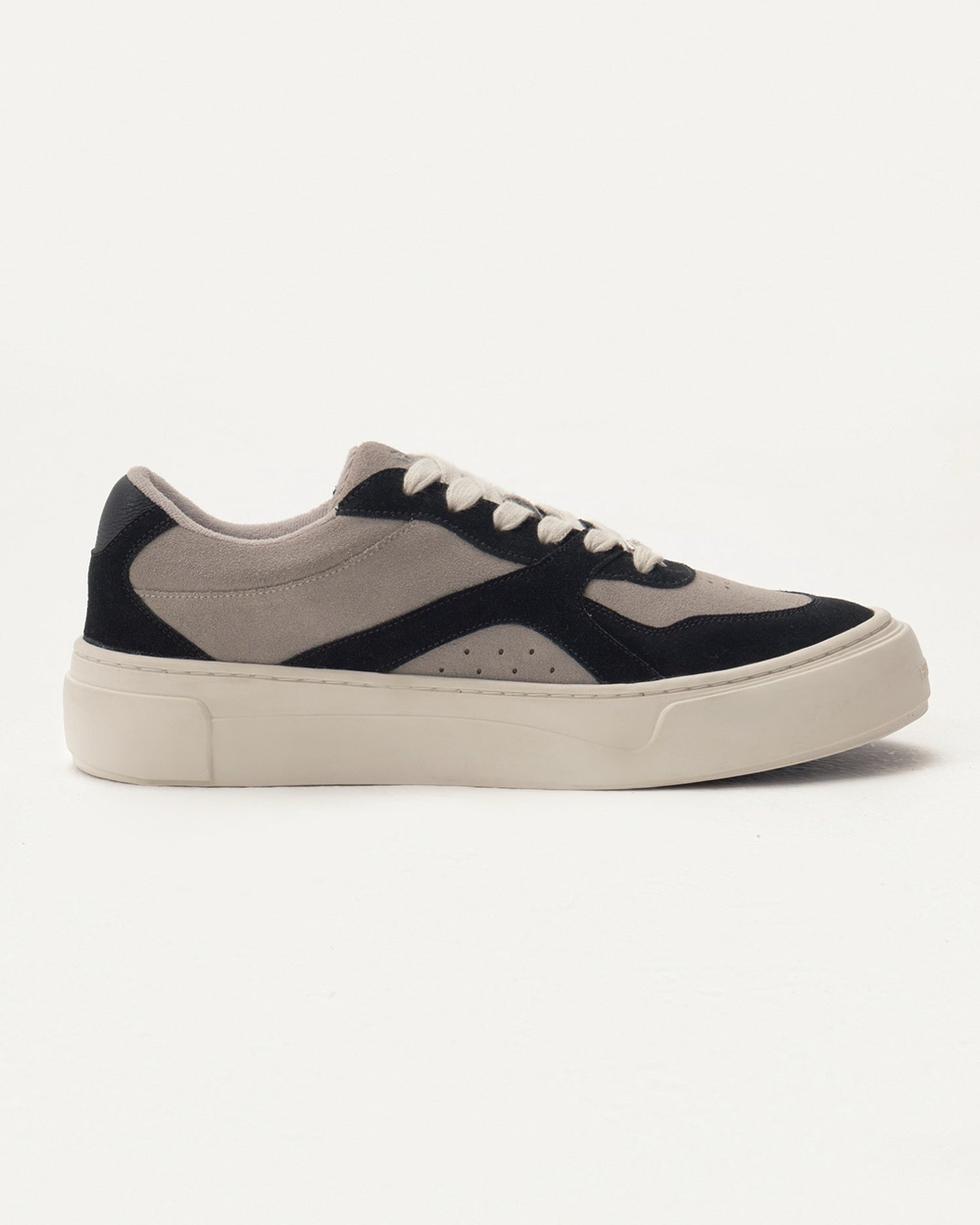 Solado bicolor de borracha com pigmentação exclusiva Herit. Upper em camurça e couro 100% premium nas cores Preto, Cinza Tímido e Floater Preto. Perfurações estratégicas para respirabilidade.