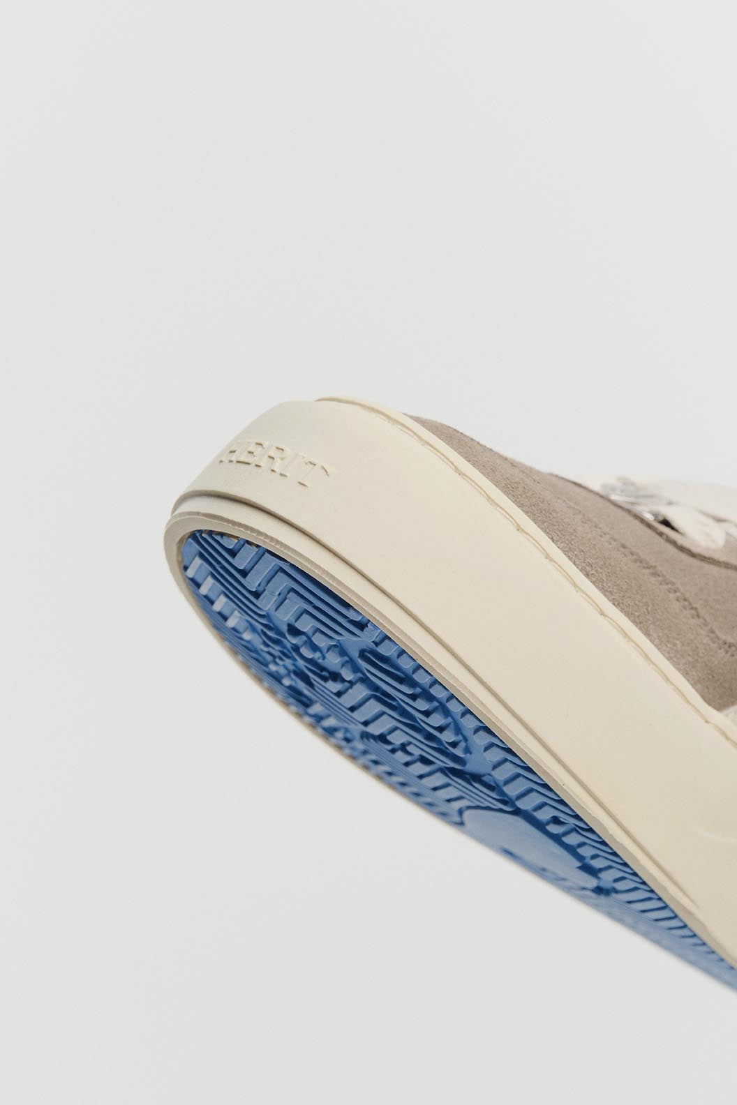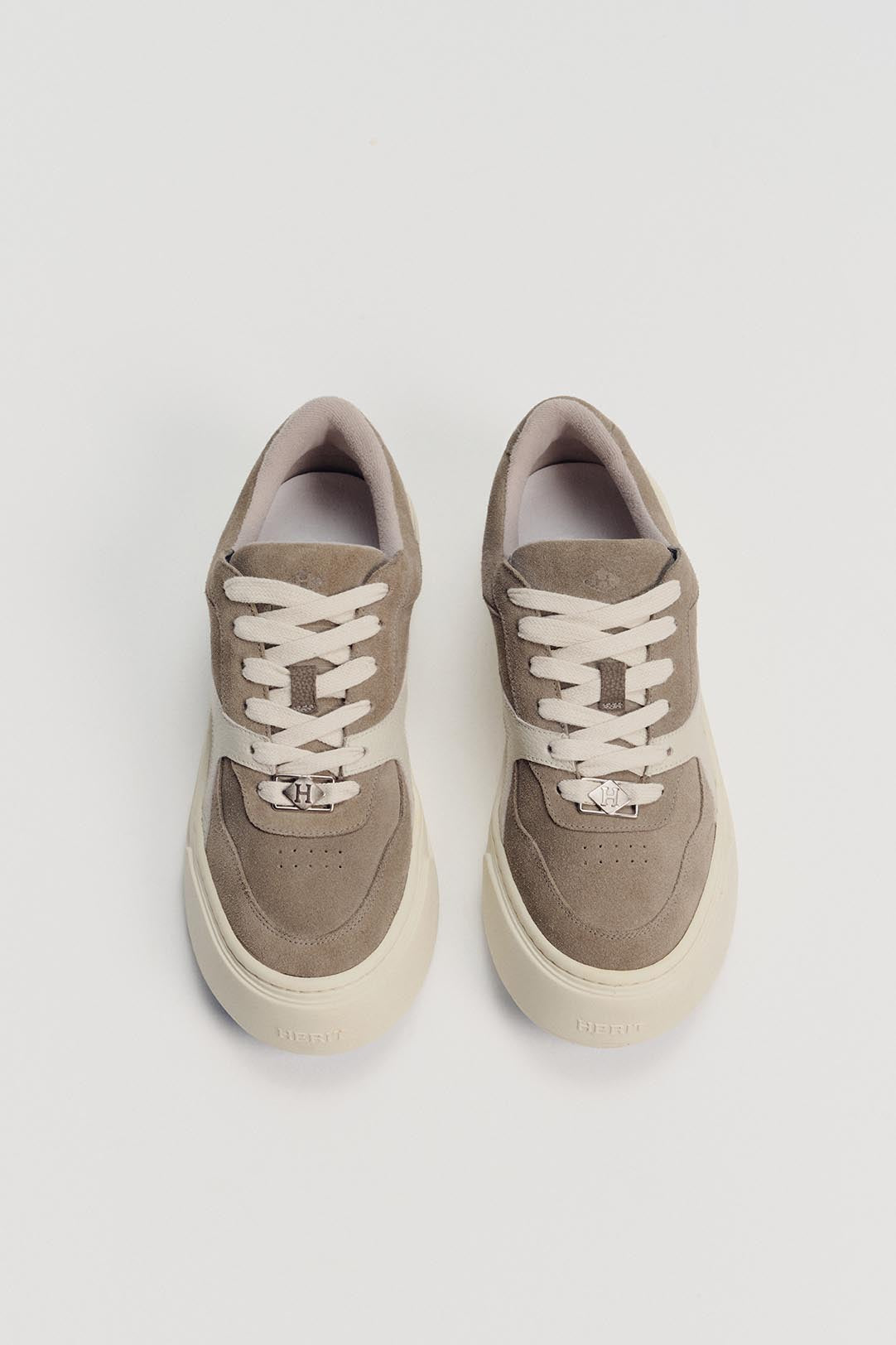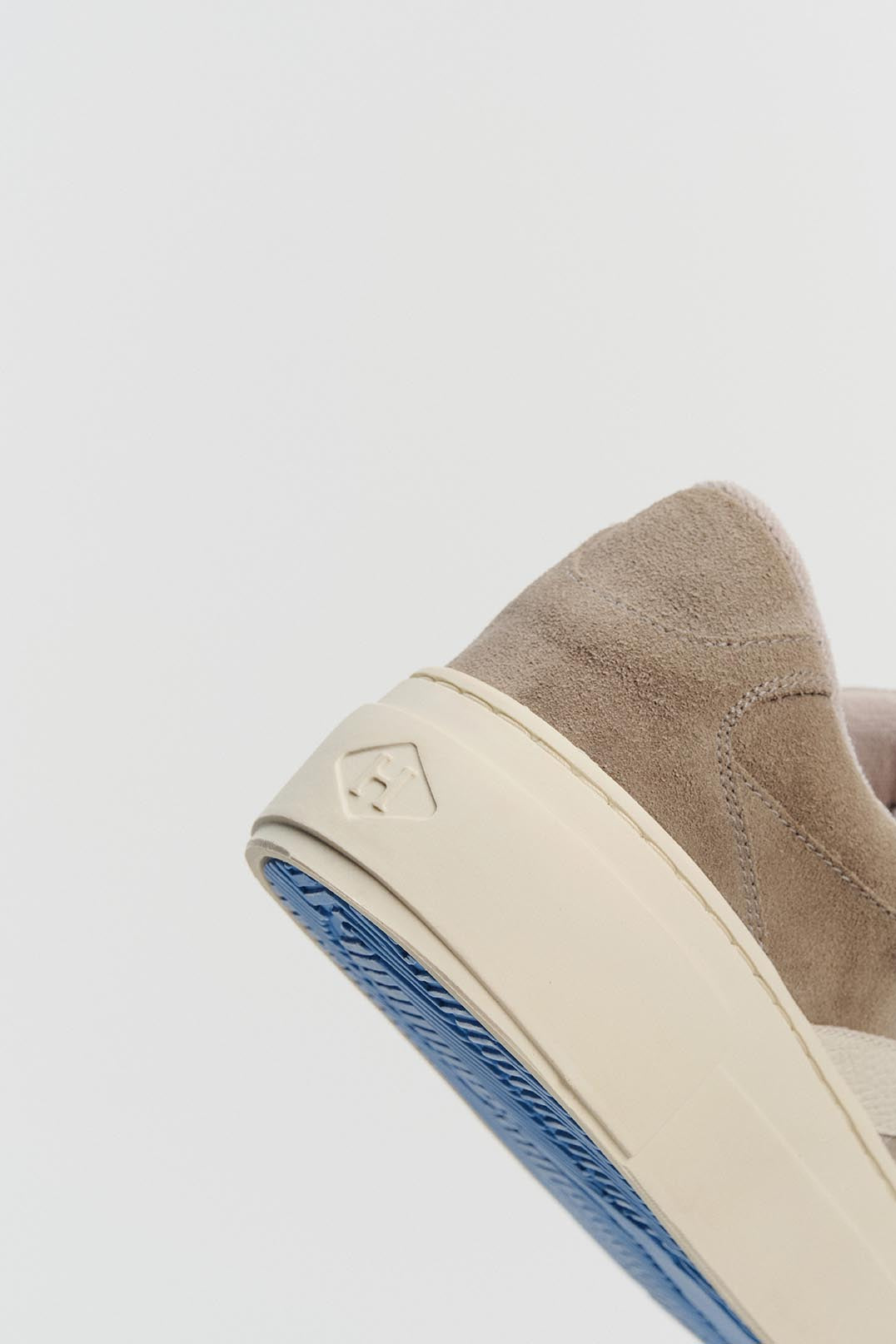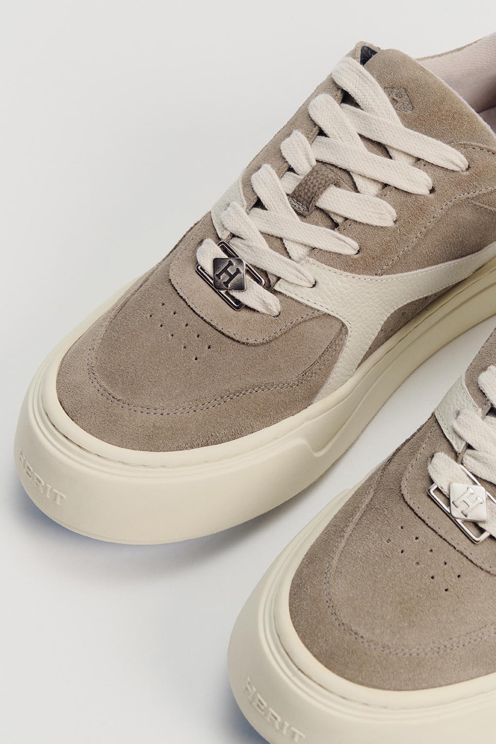 Solado bicolor de borracha com pigmentação exclusiva Herit, com cor do solado enviada de forma sortida. Upper em camurça e couro 100% premium nas tonalidades camurça smoke e floater off-white, com perfurações estratégicas para respirabilidade.