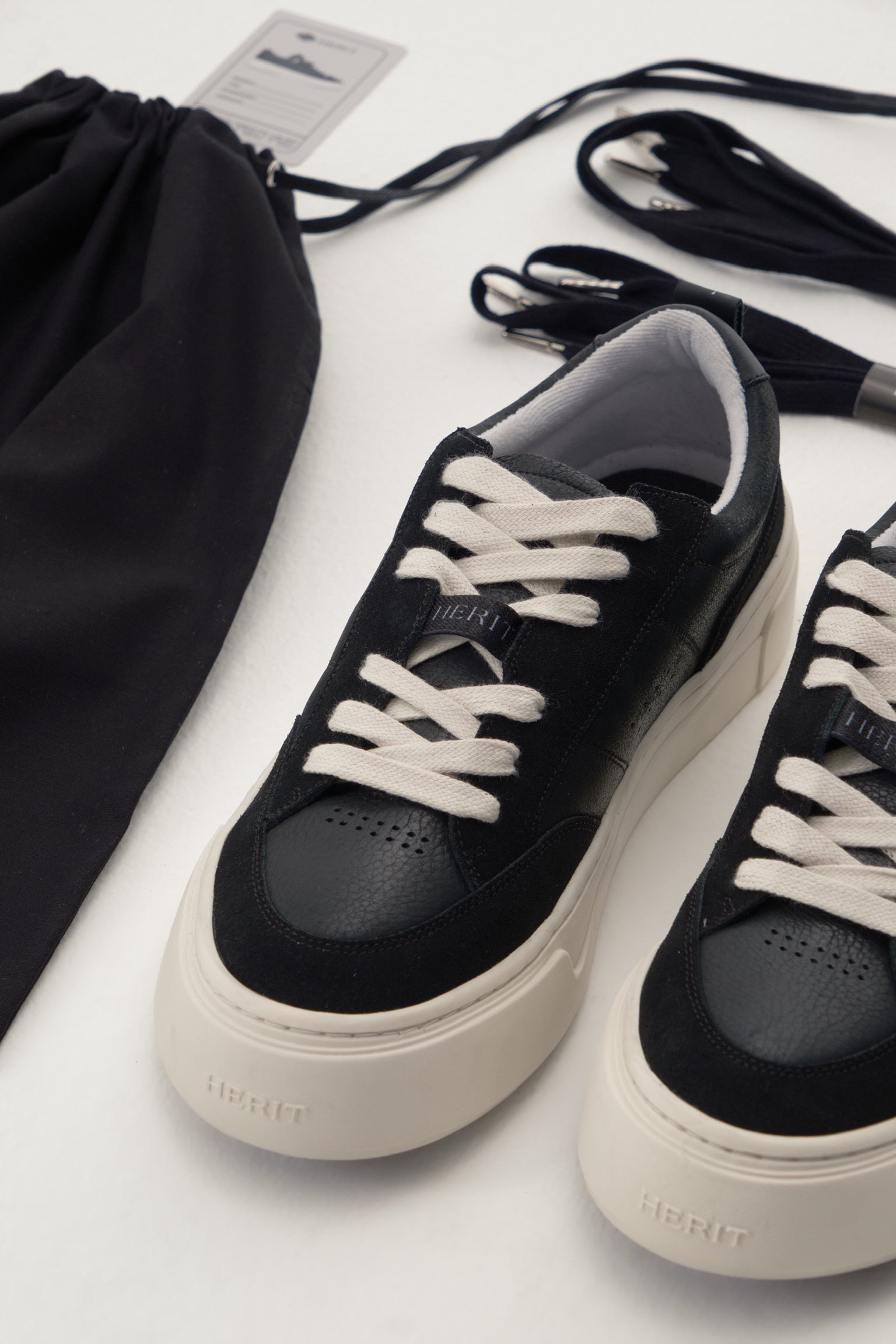 Solado bicolor de borracha com pigmentação exclusiva Herit. Upper em camurça preta, couro floater preto e couro Arpoador preto. Perfurações estratégicas e elástico central personalizado para respirabilidade e conforto térmico.