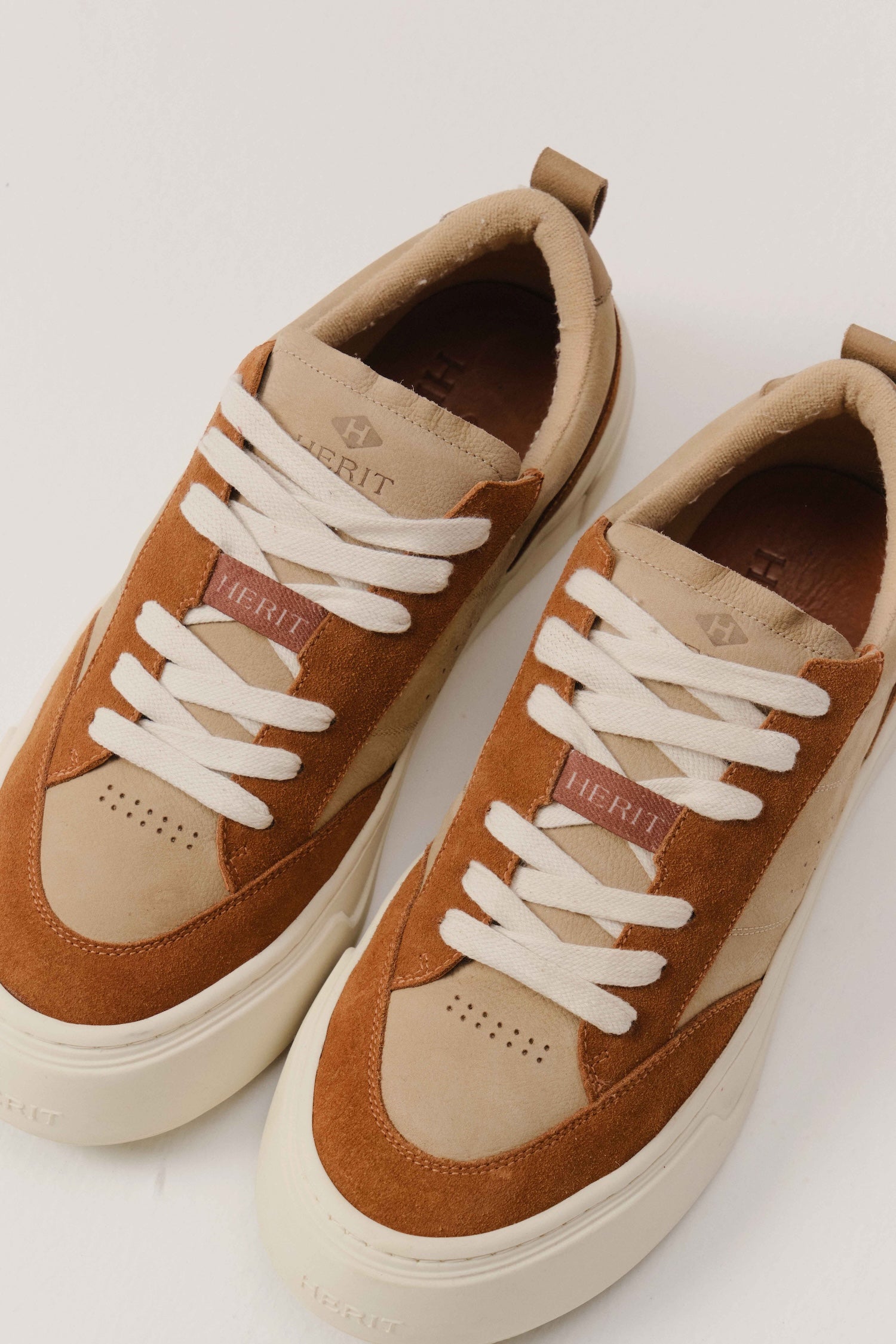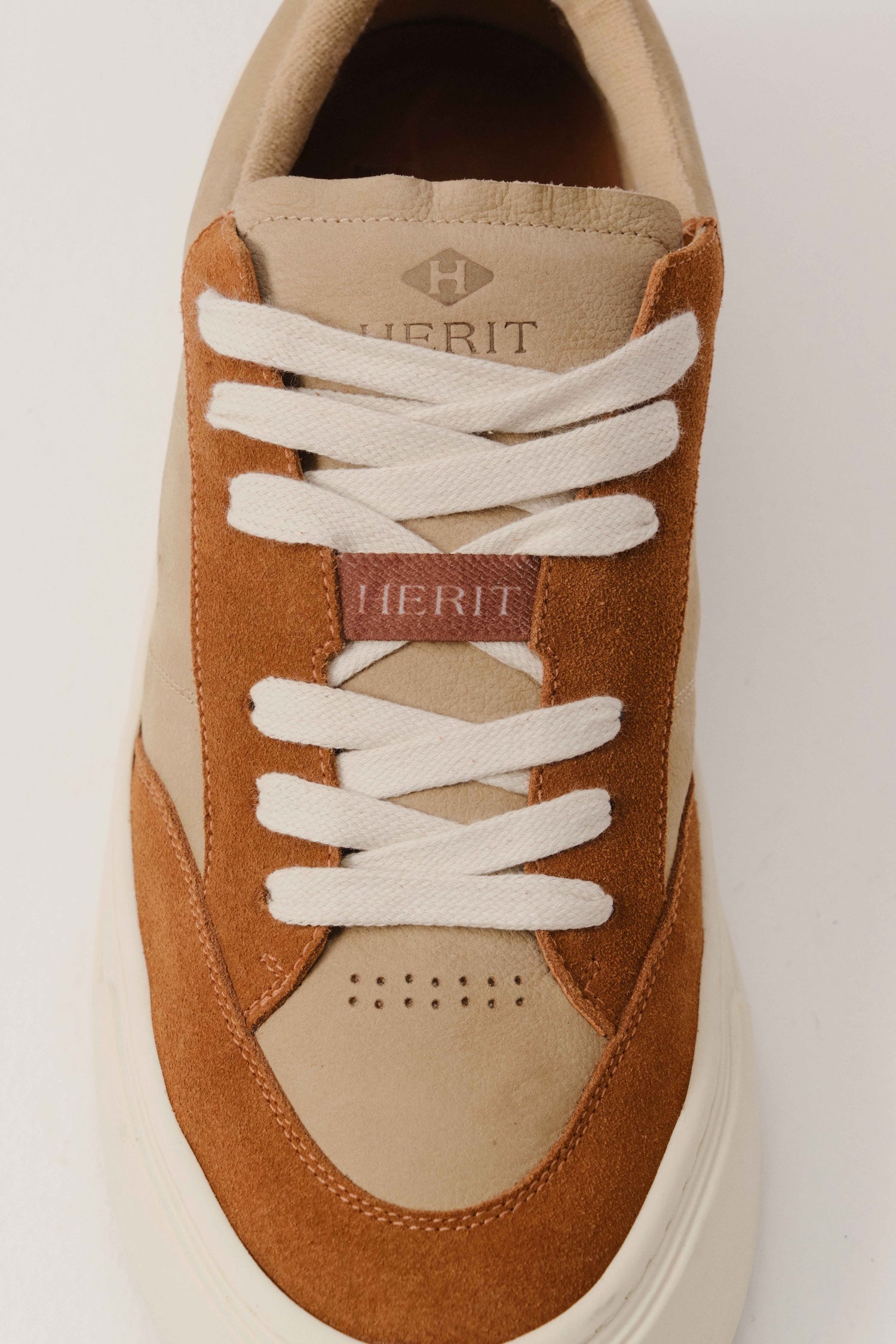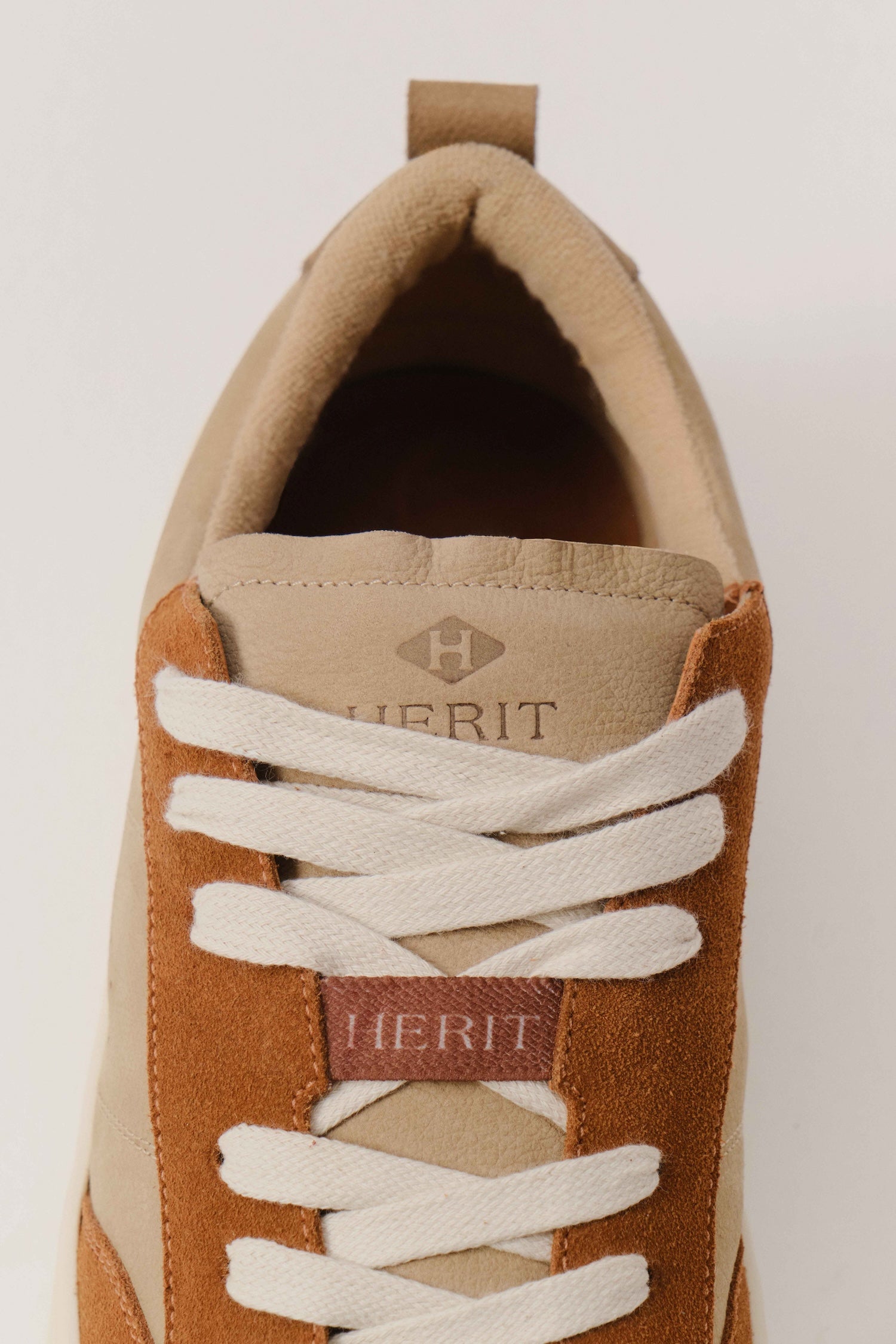 Solado bicolor de borracha com pigmentação exclusiva Herit contando com a cor sorda do solado. Upper em camurça e couro 100% premium nas cores whisky e Selaria Areia. Perfurações estratégicas para respirabilidade.
