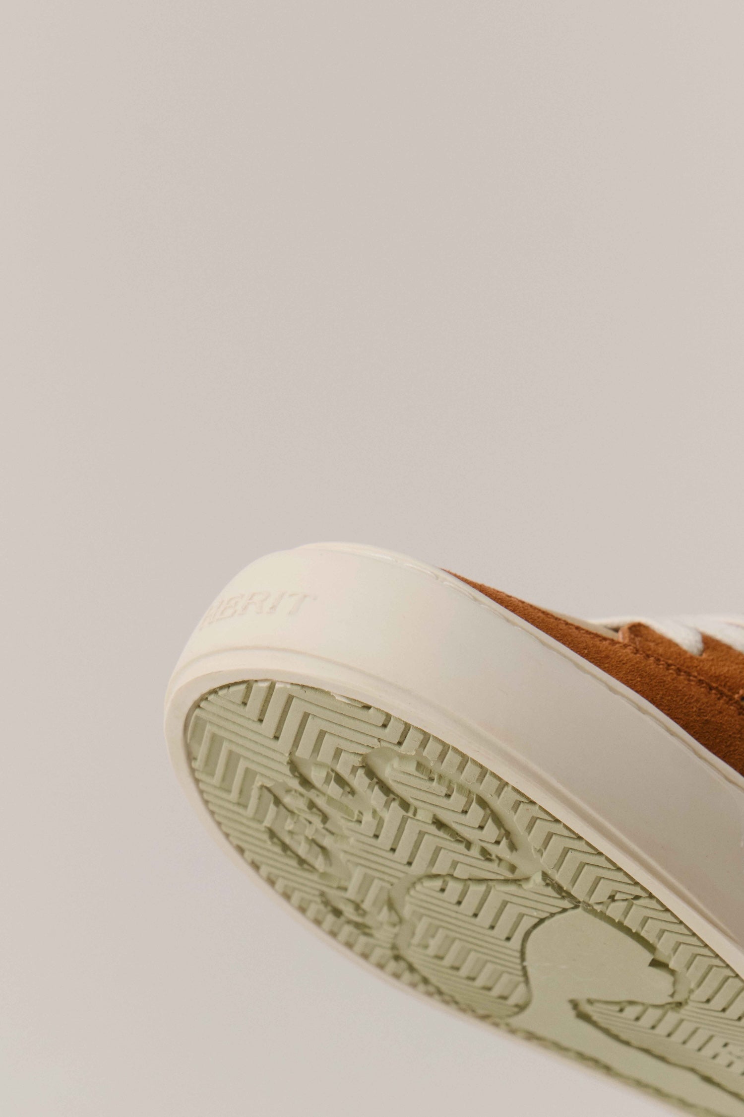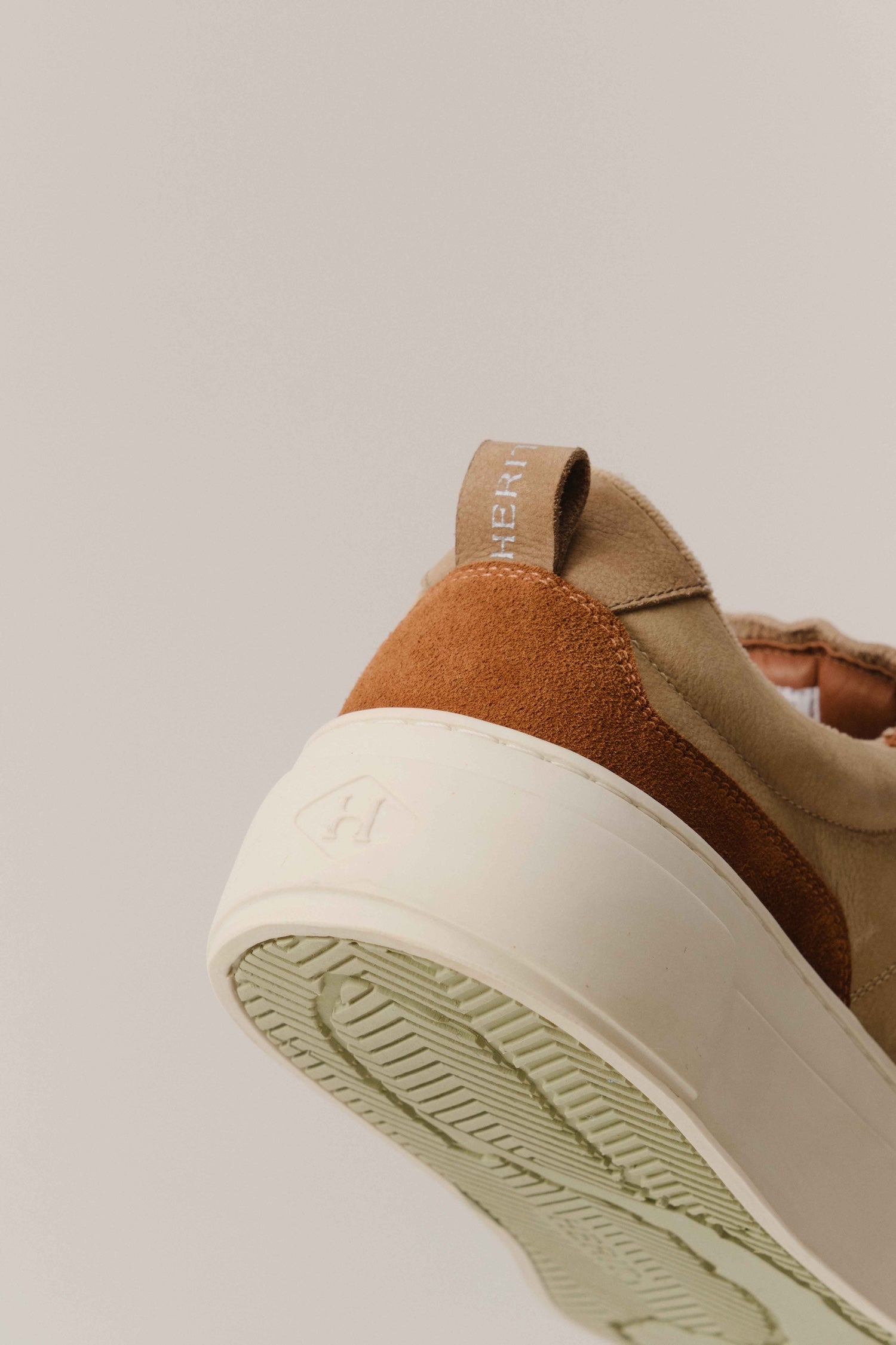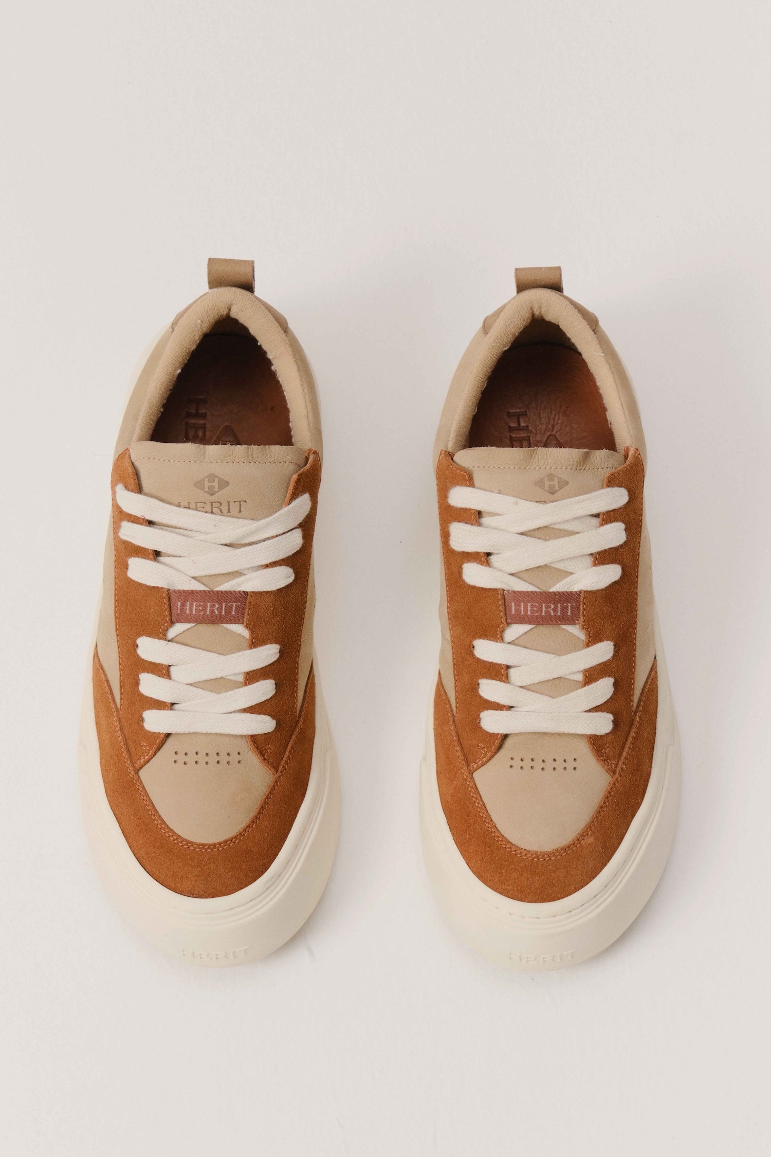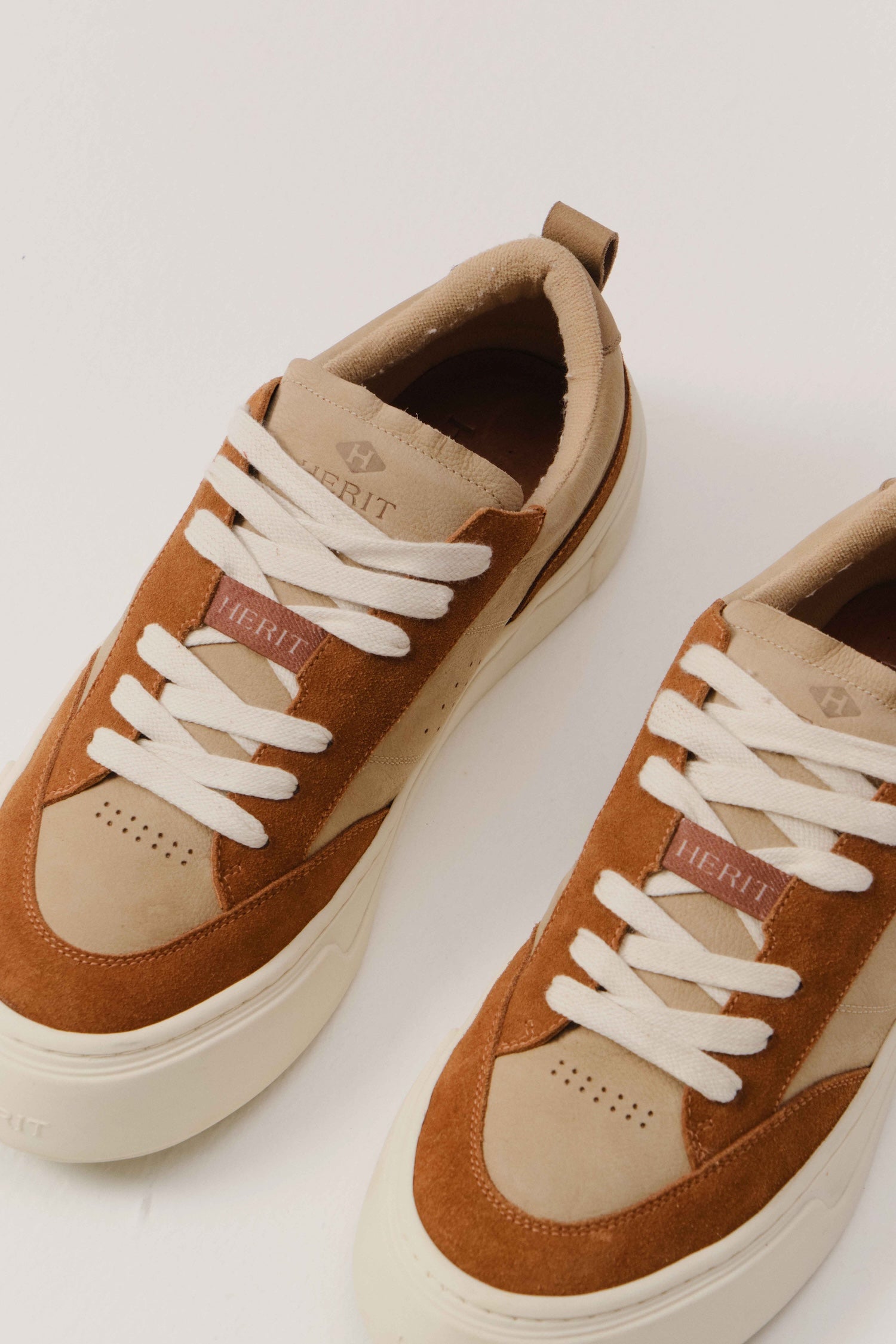 Solado bicolor de borracha com pigmentação exclusiva Herit contando com a cor sorda do solado. Upper em camurça e couro 100% premium nas cores whisky e Selaria Areia. Perfurações estratégicas para respirabilidade.