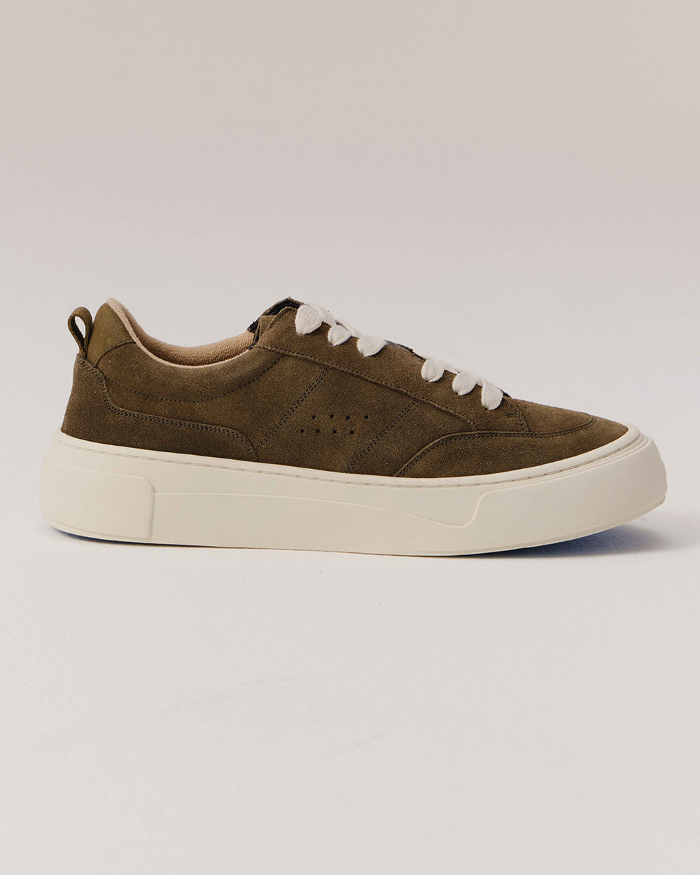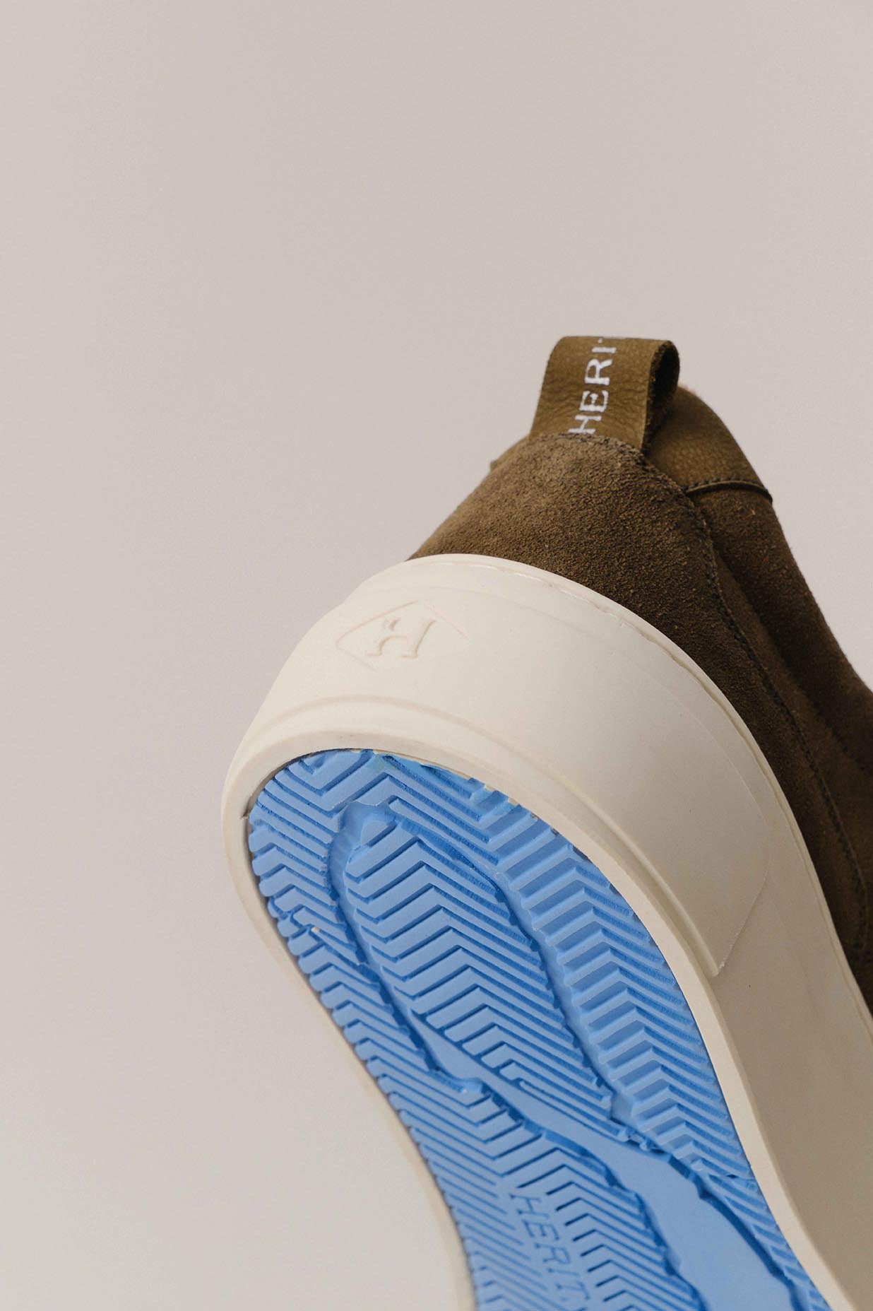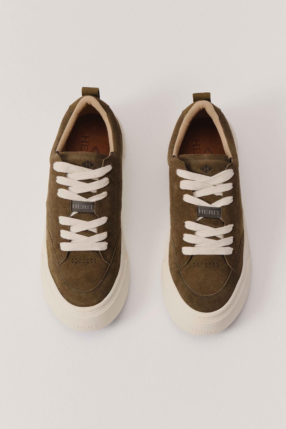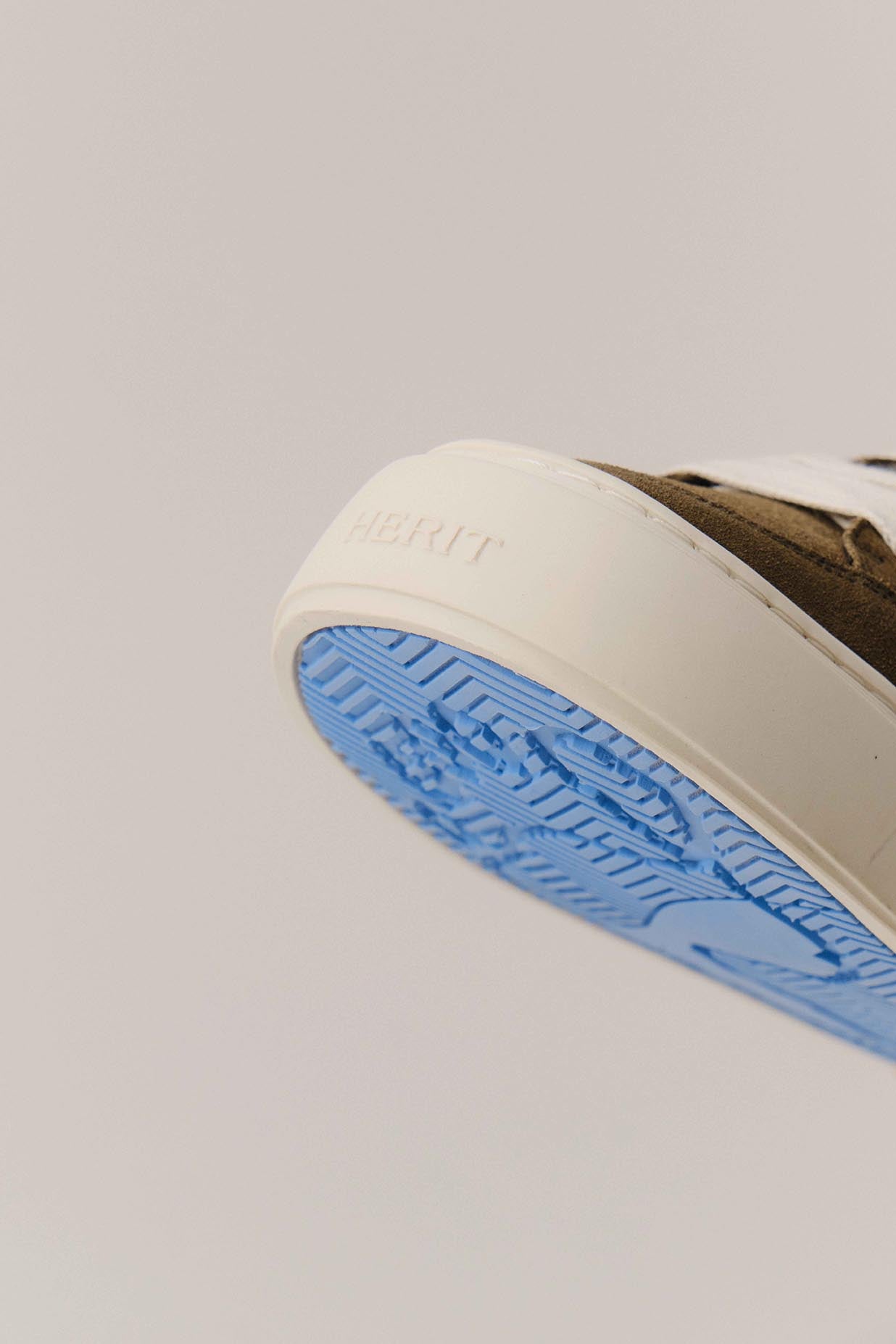 Solado bicolor de borracha com pigmentação exclusiva Herit, com cor do solado enviada de forma sortida. Upper em camurça e couro 100% premium na tonalidade oliva, com perfurações estratégicas para respirabilidade.