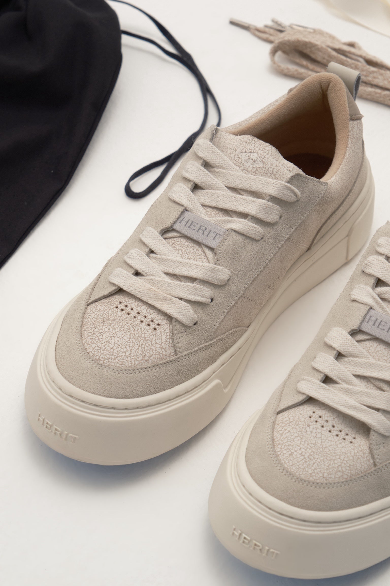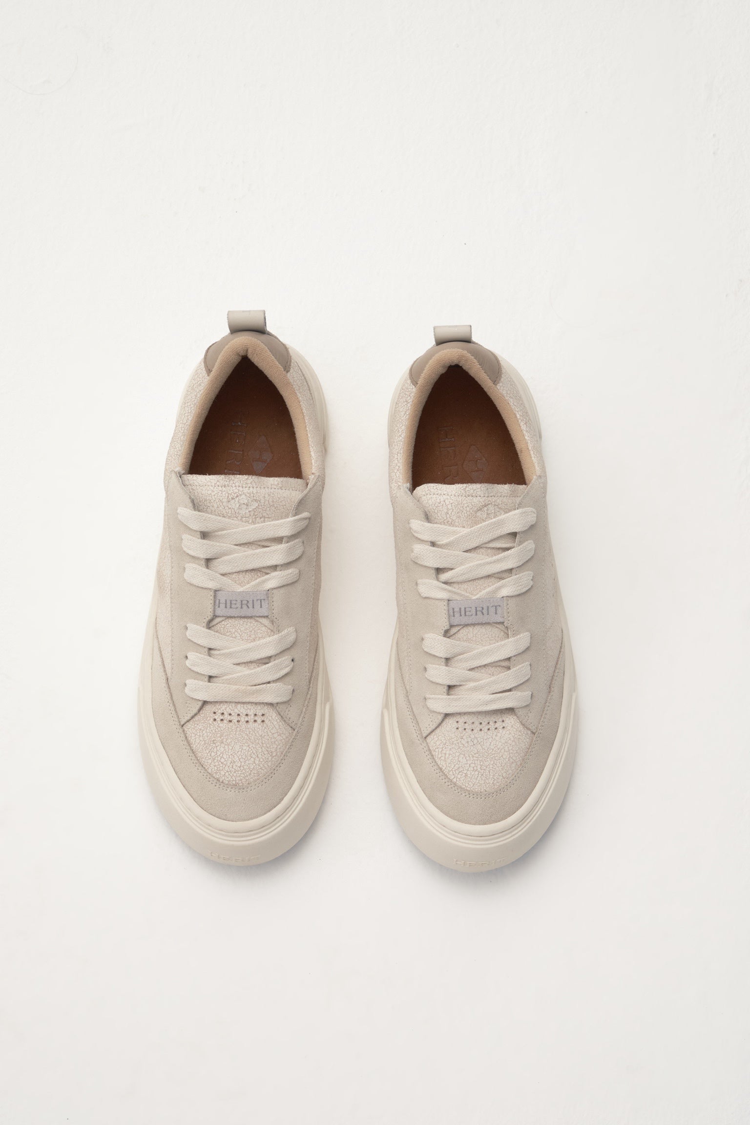 Os sneakers Herit apresentam uma forma levemente maior que o padrão do mercado. Recomendamos optar pelo seu tamanho habitual para um ajuste confortável ou considerar um número menor caso prefira um caimento mais justo.