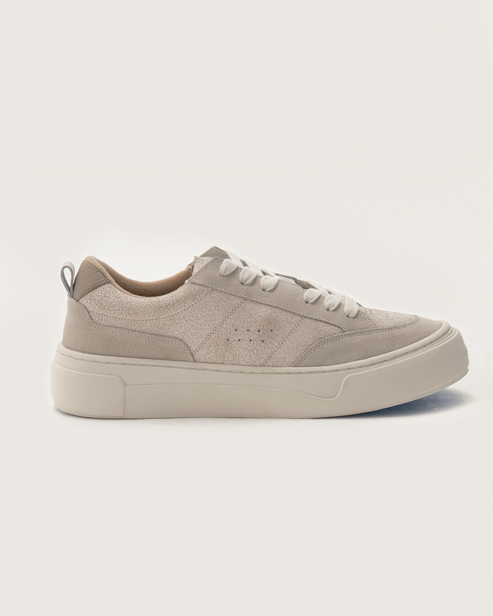 Solado bicolor de borracha com pigmentação exclusiva Herit. Upper em camurça gelo, camurça craquelada off-white e couros super light nas cores silver mink e neve. Perfurações estratégicas e elástico central personalizado garantem conforto térmico e identidade visual.