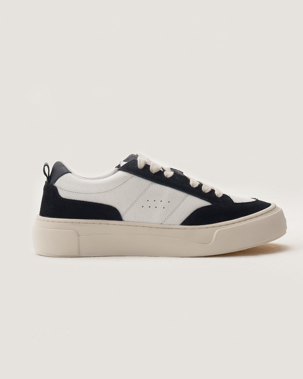 Modelo com solado bicolor de borracha pigmentada exclusiva. Upper em camurça preta, couro floater branco e couro Arpoador preto. Perfurações estratégicas para respirabilidade e elástico central personalizado. Forro interno macio e palmilha em PU revestida em couro.