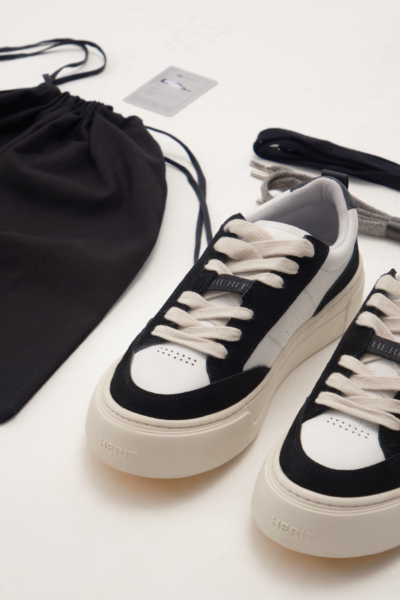 Os sneakers Herit apresentam uma forma levemente maior que o padrão do mercado. Recomendamos optar pelo seu tamanho habitual para um ajuste confortável ou considerar um número menor caso prefira um caimento mais justo.