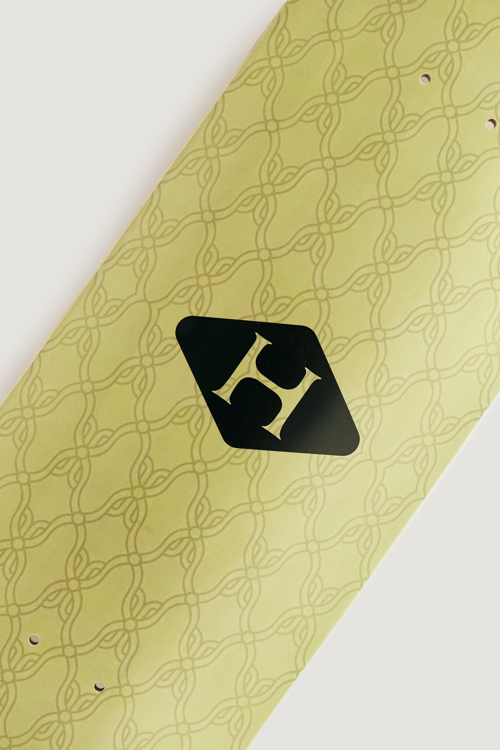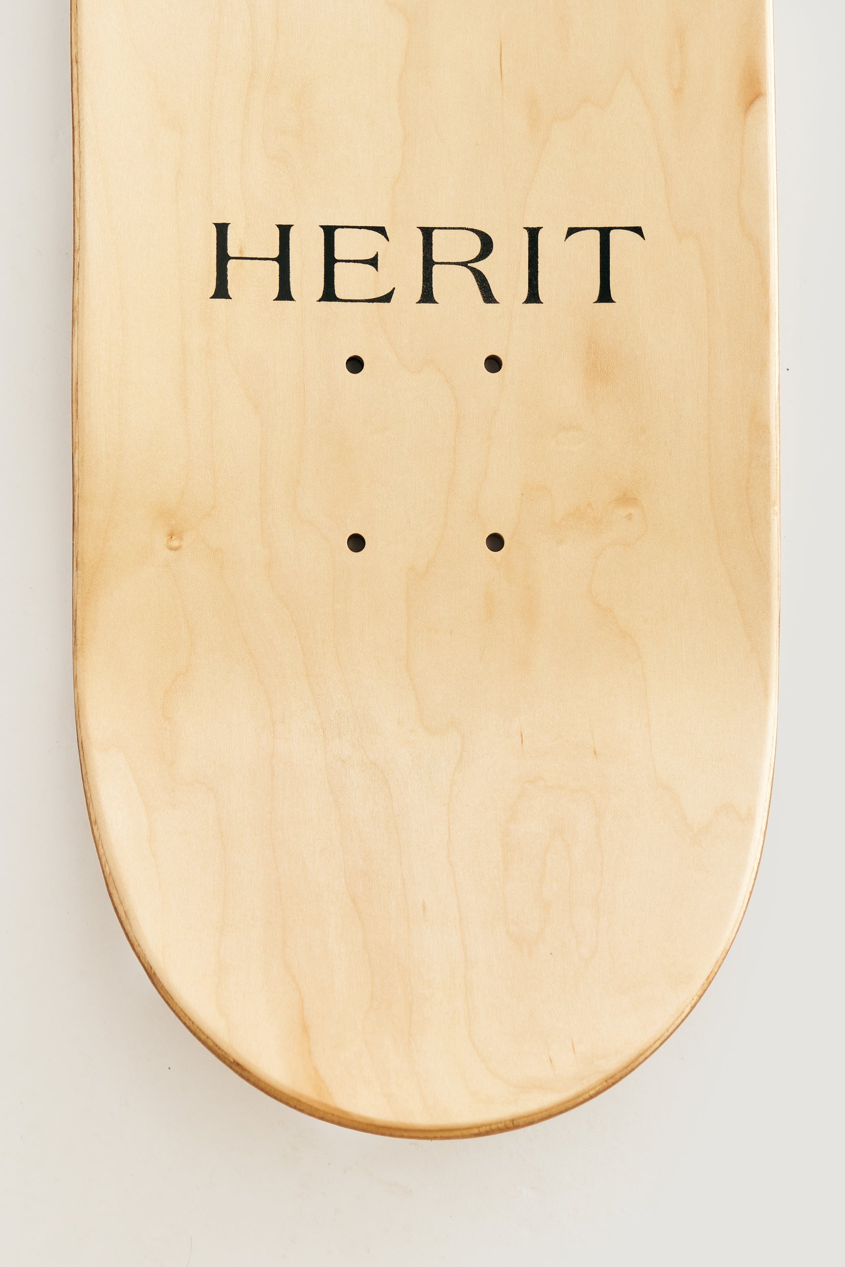 Produzido em madeira, o deck é inspirado na caixa-baú da Herit — símbolo físico da marca e guardiã de histórias. O monograma aplicado ao fundo faz referência direta a esse universo, transformando o skate em um objeto que vai além da prática esportiva e se posiciona como peça de expressão cultural.