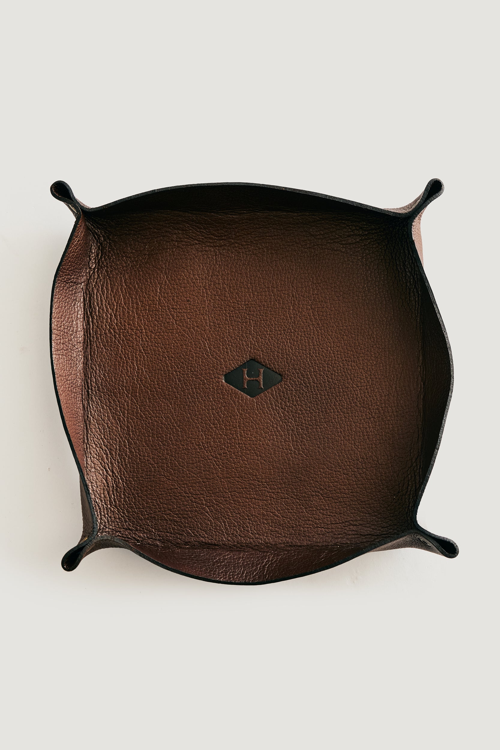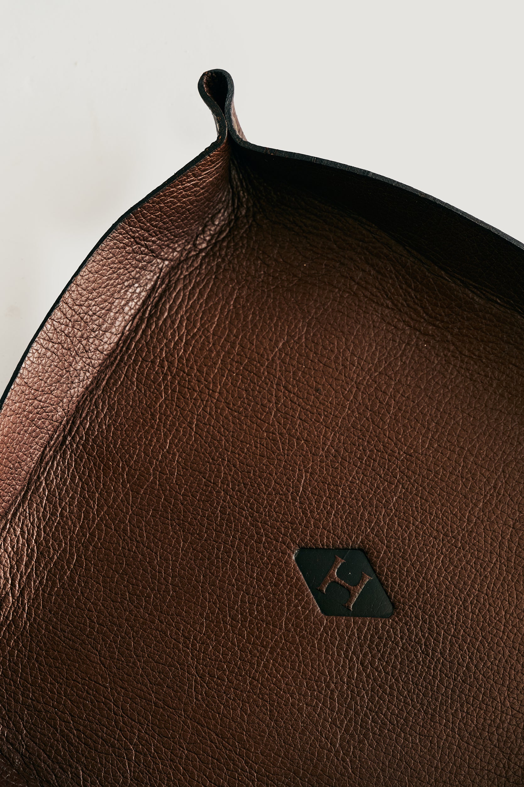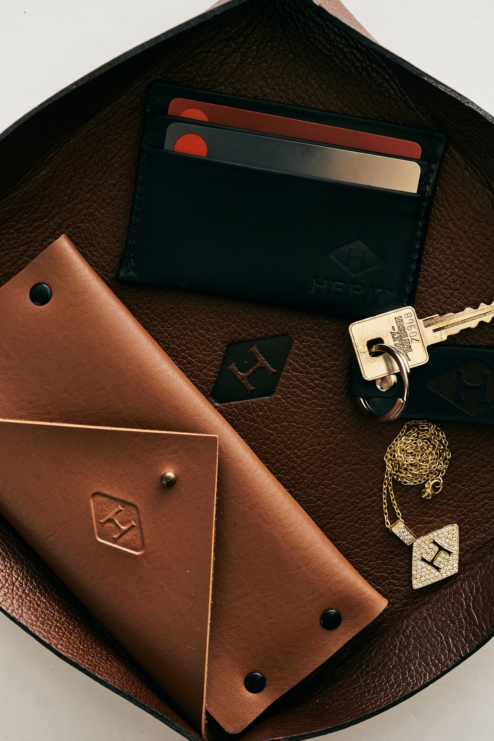 Produzido em couro na tonalidade marrom Whiskey, a peça carrega uma presença mais quente e atemporal, remetendo à maturidade, permanência e profundidade — valores alinhados ao conceito de herança que define a Herit. Seu design limpo e funcional permite acomodar objetos do cotidiano como anéis, carteiras, chaves e acessórios, mantendo tudo à mão de forma elegante e organizada.